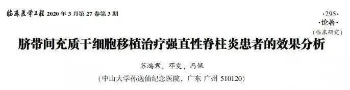 2020年,一份臨床研究中選取中山大學孫逸仙紀念醫(yī)院2016年2月至2019年1月收治的40例強直性脊柱炎患者,隨機分為對照組和觀察組各20例。對照組采用免疫及生物制劑治療,觀察組采用臍帶間充質干細胞移植治療,對比兩組的臨床治療效果,可觀察組治療總有效率高于對照組(P<0.05)。
