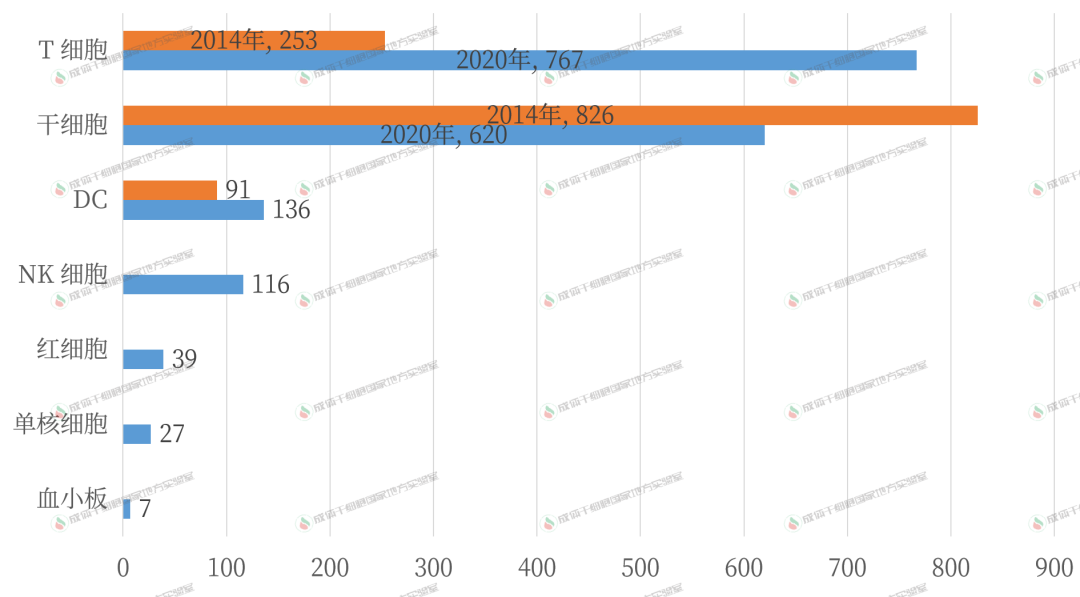 有研究者分析了截止 2020 年 8 月的 28 種獲批上市的細胞治療產品(本文更新到 32 種)和 1705 種當前活躍的細胞治療臨床試驗。他們發(fā)現(xiàn):和 6 年前相比,免疫細胞臨床試驗數量增長了 2 倍。細胞產品增加了 18 種,其中干細胞和其他細胞仍占據優(yōu)勢。
