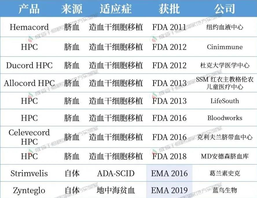 目前獲批的造血干細胞療法是 10 種。包括 FDA 的 8 種臍血產品,都用于血液病和免疫缺陷的治療。EMA 批準了 2 種自體造血干細胞基因療法,Strimvelis 用于腺苷脫氨酶缺乏癥 (ADA-SCID),Zynteglo 用于治療輸血依賴性地中海貧血癥。