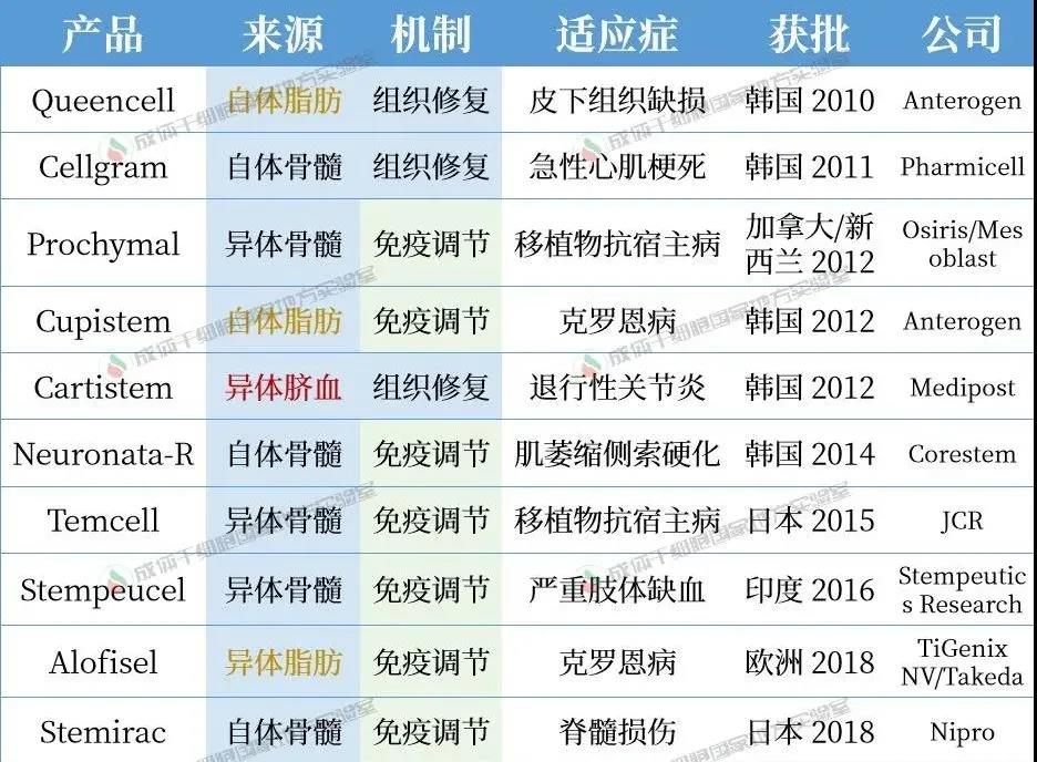 截至目前,有 10 種間充質干細胞(MSC)產品在全球獲得批準(參見 全球上市MSC藥物盤點),但沒有一款獲得 FDA 的批準。目前的 MSC 產品根據其作用機制和批準的適應癥分為兩大類:組織修復和免疫調節(jié)。