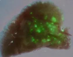 ▲綠色熒光標(biāo)記的人肺干細胞成功移植到小鼠肺內(nèi)