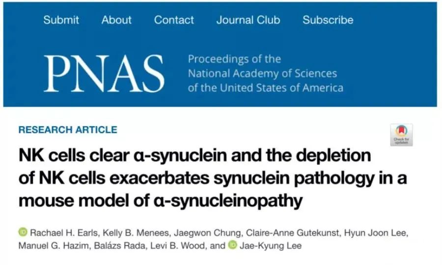 2020年3月13日發(fā)表在的《美國國家科學(xué)院院刊Proceedings of the National Academy of Sciences》上,一篇題為“NK細(xì)胞清除α-突觸核蛋白及NK細(xì)胞耗竭加重α-突觸核病的研究NK cells clear α-synuclein and the depletion of NK cells exacerbates synuclein pathology in a mouse model of α-synucleinopathy”的研究表明,NK細(xì)胞不僅是攻擊“入侵者”的高效“清除劑”,而且對(duì)調(diào)節(jié)、抑制腦組織炎癥和異常蛋白質(zhì)聚集(治療帕金森癥和其他神經(jīng)退行性疾病)至關(guān)重要。