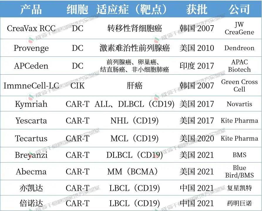 目前,只有 T 細胞和樹突狀細胞(DC)產品被批準上市。其中大多數 T 細胞產品是用于血液系統(tǒng)惡性腫瘤的嵌合抗原受體T細胞(CAR-T)療法,而 DC 產品則用于實體腫瘤的疫苗。