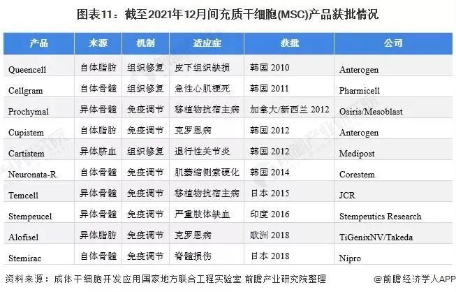 目前獲批的間充質(zhì)干細(xì)胞(MSC)產(chǎn)品同樣是10種,目前的MSC產(chǎn)品根據(jù)其作用機(jī)制和批準(zhǔn)的適應(yīng)癥分為兩大類:組織修復(fù)和免疫調(diào)節(jié)。